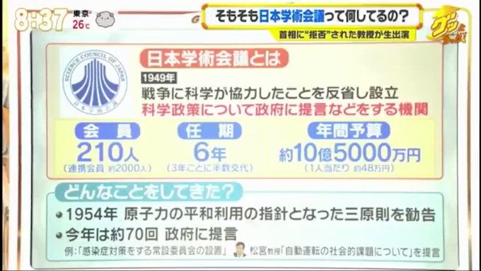 「学問の自由を守れ」← 自由を阻害している事を具体的に説明できる人います? 「拒否権なんて無い」← 任命権って任命しない自由を含みませんか? 言っていることのデタラメさが小学生並みなんですが、朝日・毎日大新聞様はたしなめないんですか(笑) 大新聞様「やっと見つけた政権批判のタネだから大事に大事に育てます」(笑) 日本学術会議は政府への政策提言などを行い、「学者の国会」とも呼ばれる。運営は国庫でまかなわれ、29年度予算では約10億5千万円が計上されている。 学者先生たちも金と利権は手放したくないとみえる(笑)